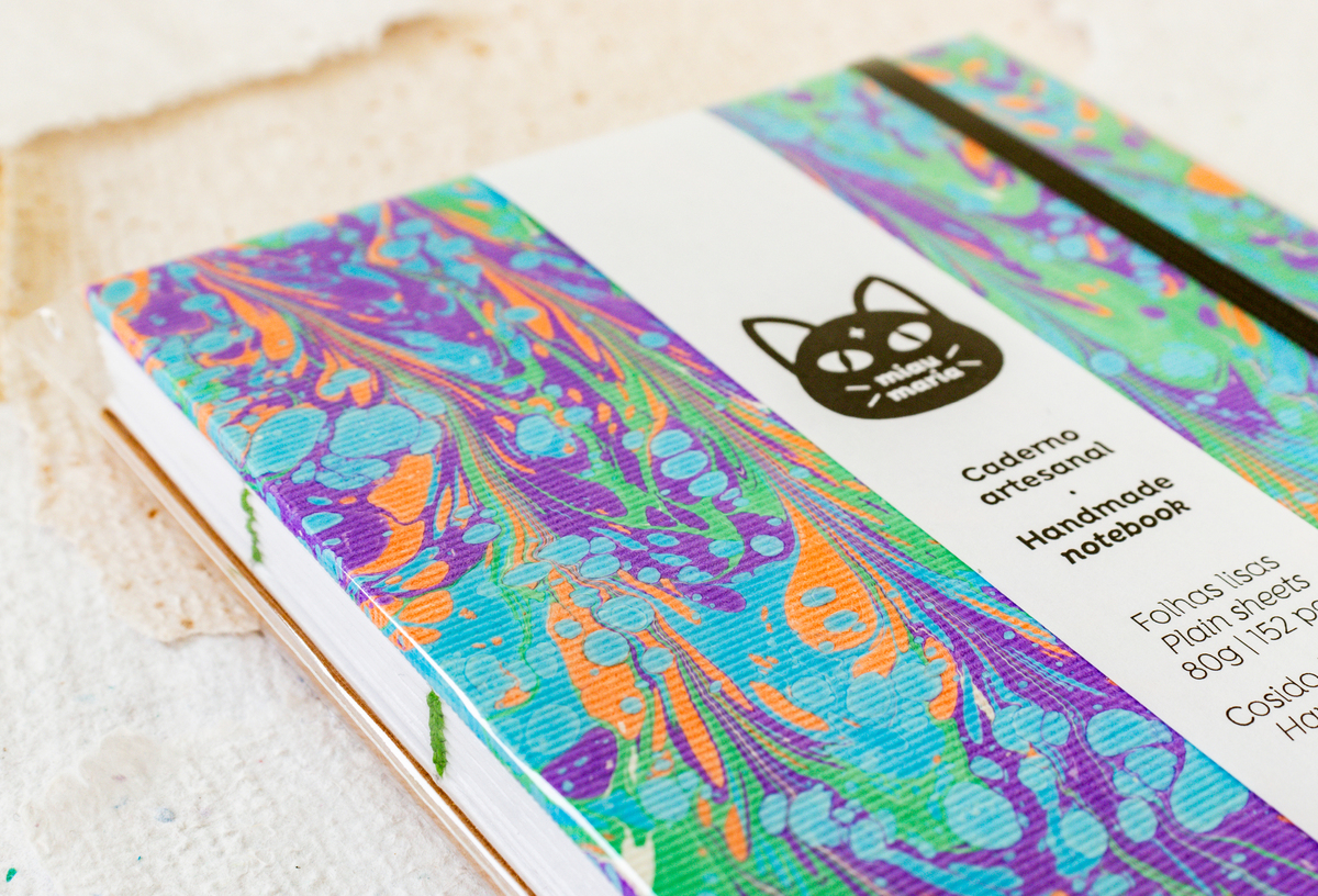 As capas são marmoreadas com tinta acrílica, que por si só é um material resistente, cujas cores não perdem saturação com o passar do tempo. O papel da capa possui ainda uma camada de verniz protetor, que confere um brilho extra. Por ser uma peça feita integralmente em papel não plastificado, deve ser mantida longe de fontes de água. Tendo esse cuidado básico, esta peça durará anos.