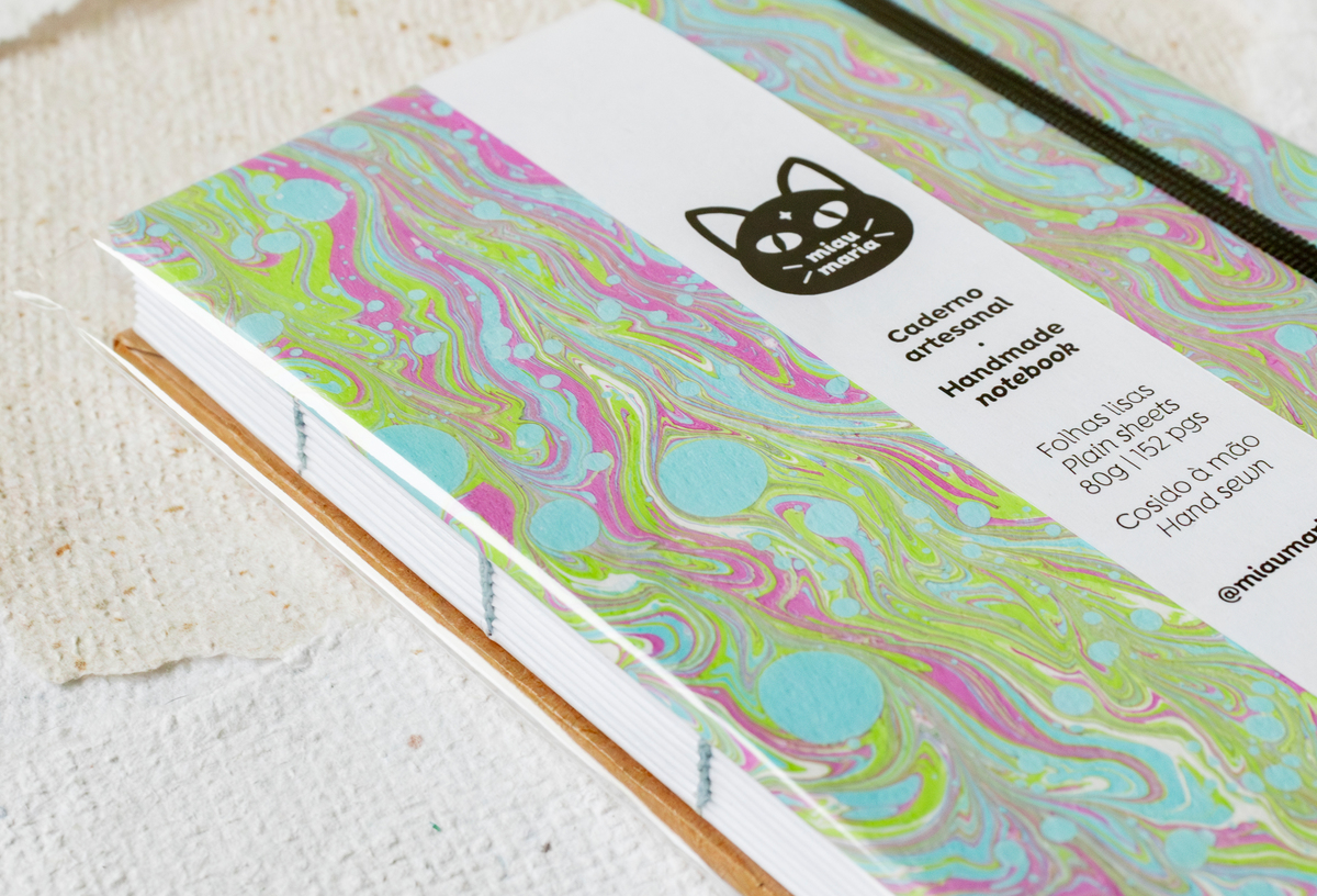 As capas são marmoreadas com tinta acrílica, que por si só é um material resistente, cujas cores não perdem saturação com o passar do tempo. O papel da capa possui ainda uma camada de verniz protetor, que confere um brilho extra. Por ser uma peça feita integralmente em papel não plastificado, deve ser mantida longe de fontes de água. Tendo esse cuidado básico, esta peça durará anos.