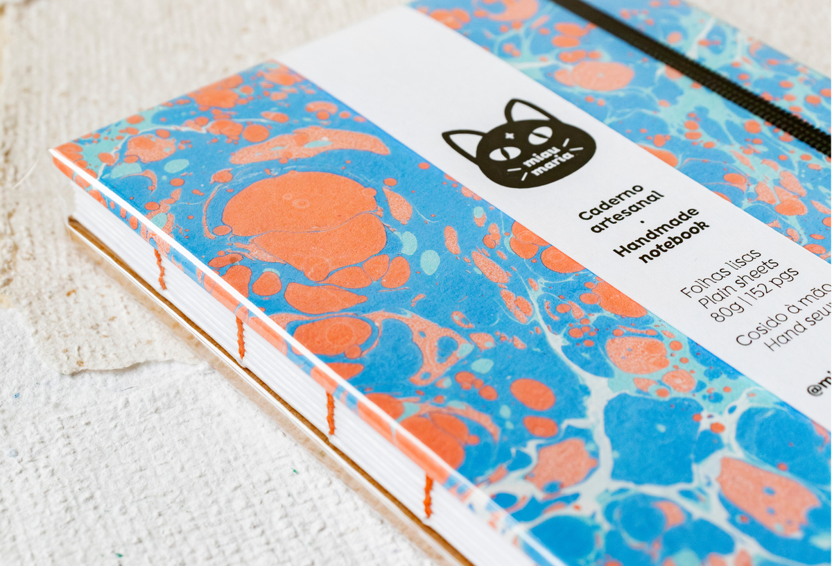 As capas são marmoreadas com tinta acrílica, que por si só é um material resistente, cujas cores não perdem saturação com o passar do tempo. O papel da capa possui ainda uma camada de verniz protetor, que confere um brilho extra. Por ser uma peça feita integralmente em papel não plastificado, deve ser mantida longe de fontes de água. Tendo esse cuidado básico, esta peça durará anos.